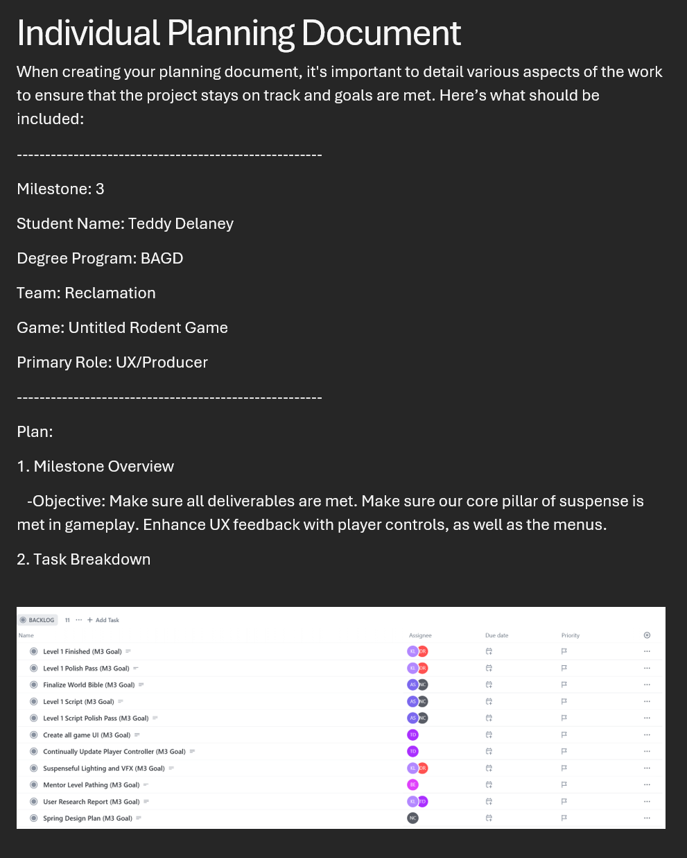 I centralized milestone documentation in a shared ClickUp task board, ensuring decisions persisted beyond meetings and reducing interpretation drift.